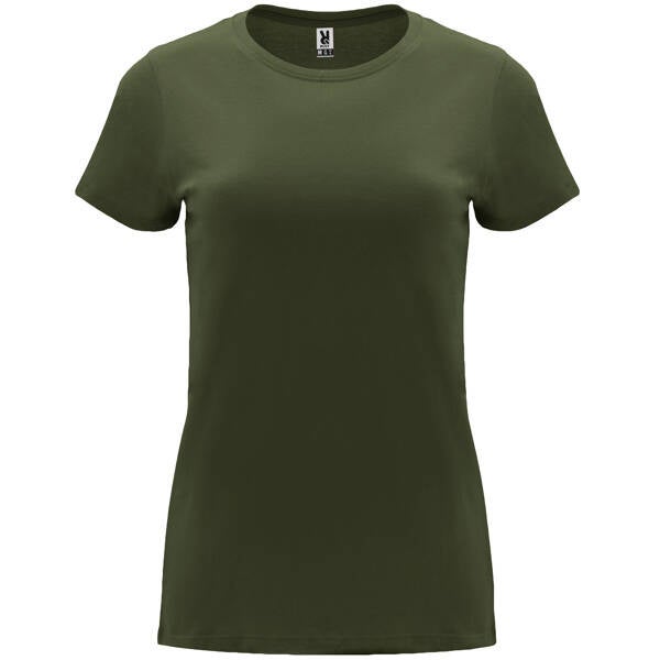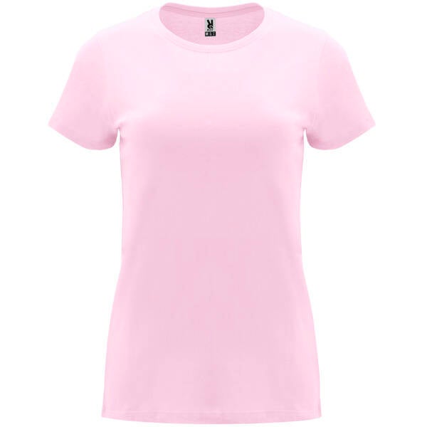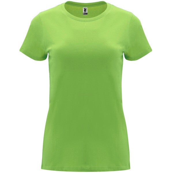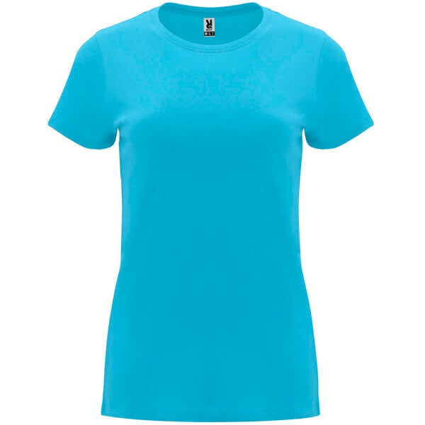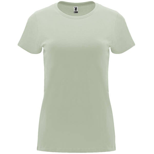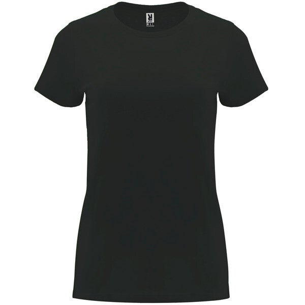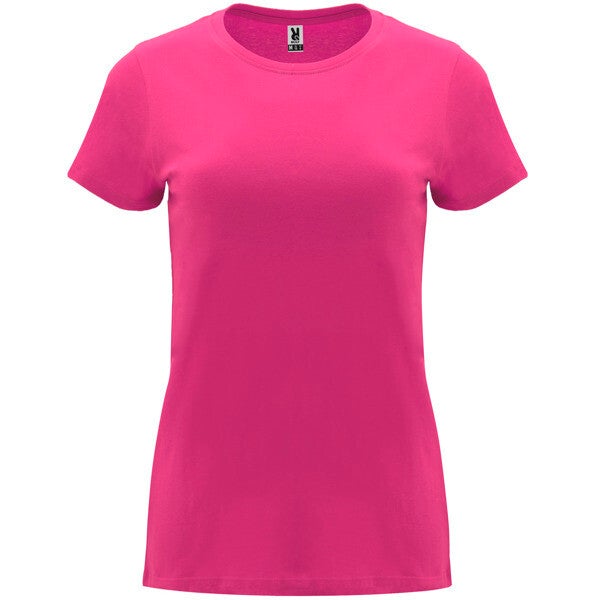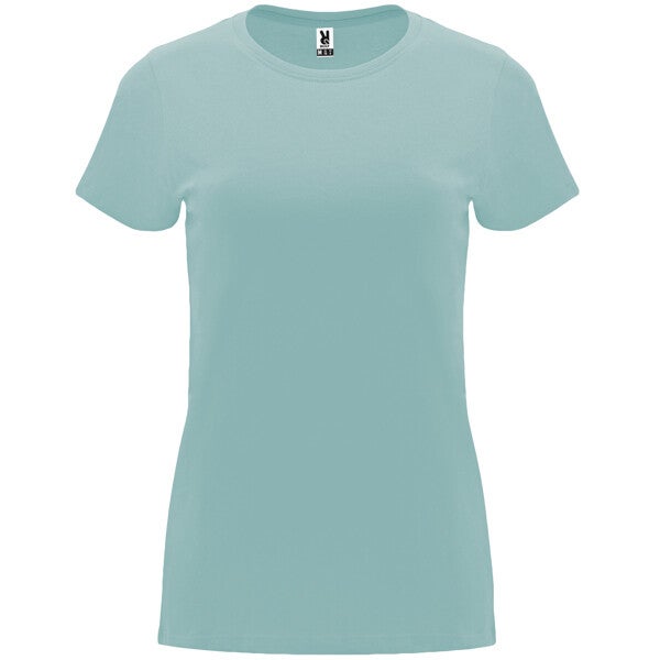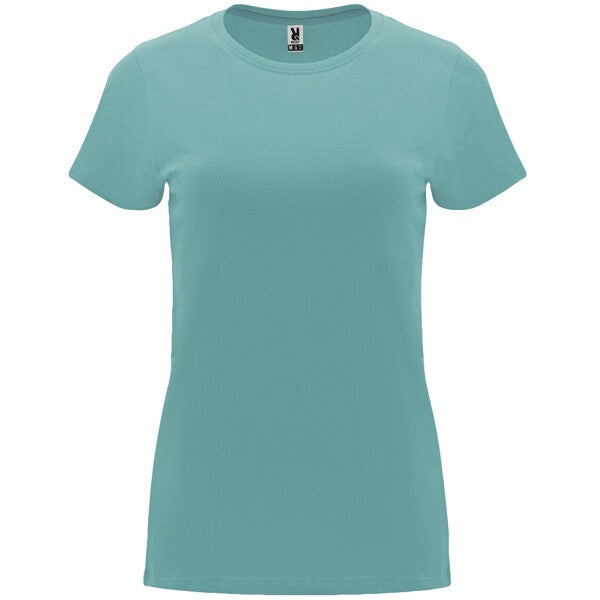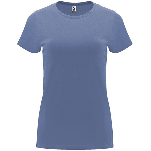 Camiseta de corte femenino de manga corta entallada. Cuello redondo en canalé 1x1 con cubre costuras interior. Costuras