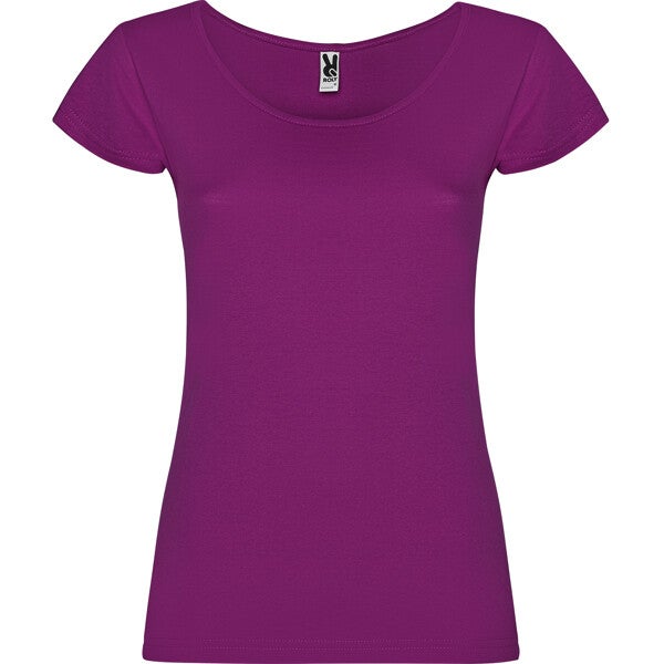 Camiseta de mujer de manga corta, escote redondo, ribeteado y pronunciado. Costuras laterales y de corte ajustado. Impresión NO incluída. (Consulte más abajo)
