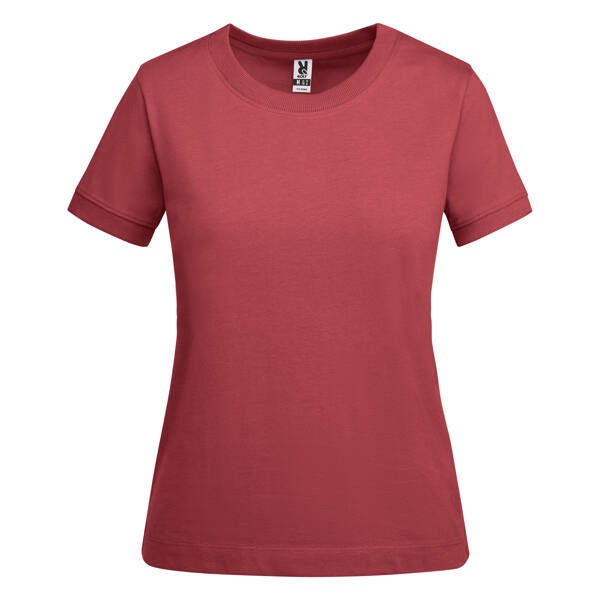 Camiseta gruesa de mujer en manga corta de algodón. Cuello redondo y ribete mangas en canalé ancho 2x1. Cubrecosturas reforzado en cuello. Costuras laterales. Logo Roly a tono en bajo lateral izquierdo. Costura ancha en el bajo. Impresión NO incluída. (Consulte más abajo)