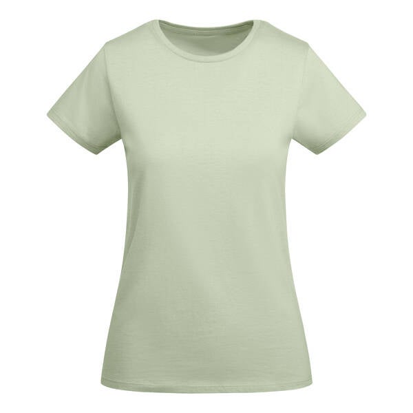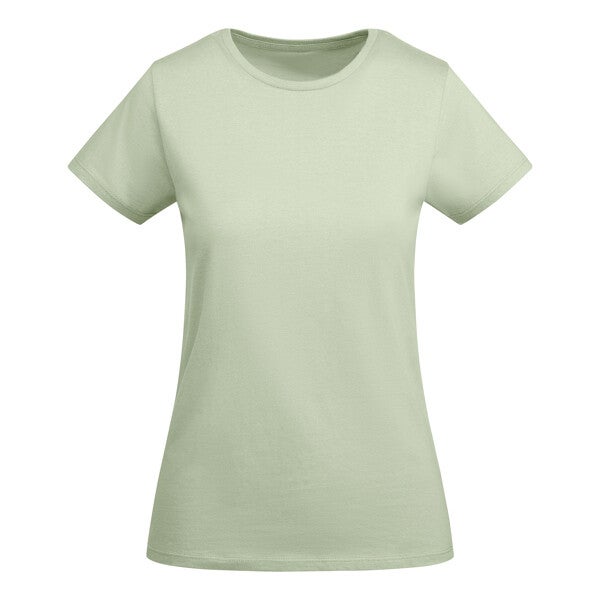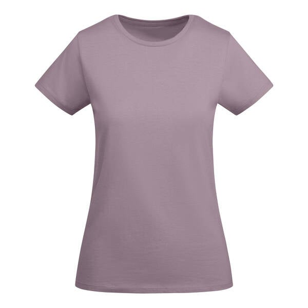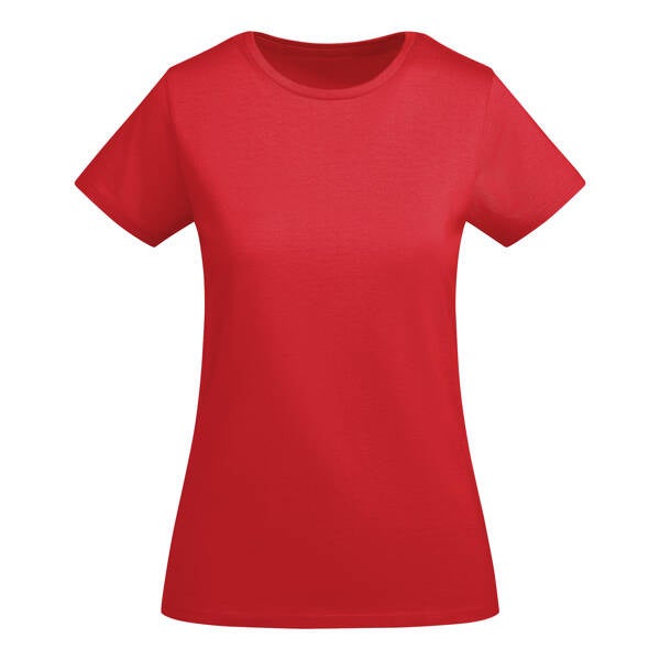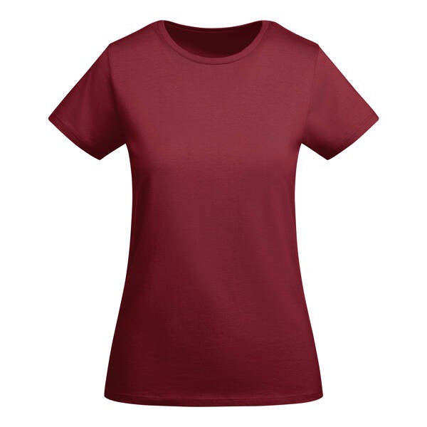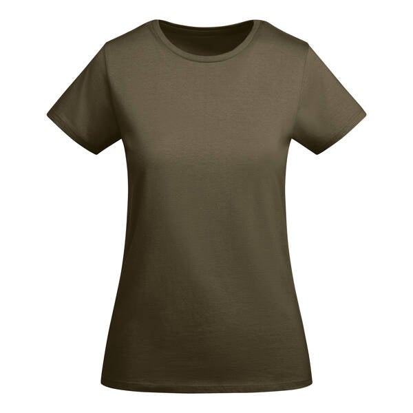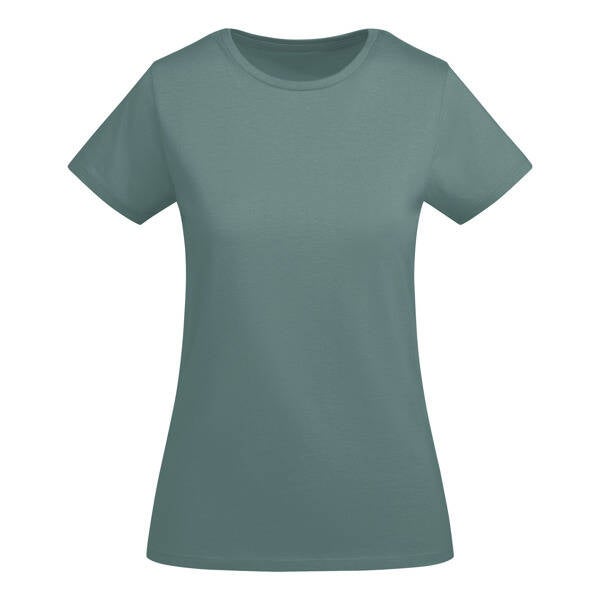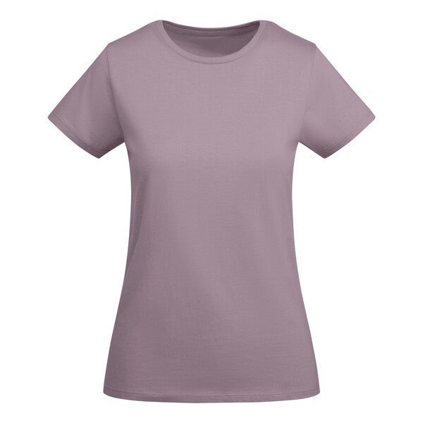 Camiseta de mujer entallada de manga corta en algodón orgánico certificado OCS. Cuello redondo en canalé 1x1. Cubrecosturas reforzado en cuello. Costuras laterales. Impresión NO incluída. (Consulte más abajo)