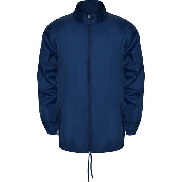 Chubasquero unisex. Cuello alto y capucha extraíble con cordones ajustables. Cremallera central al tono con tirador. Dos bolsillos laterales de cremallera con solapa. Puños elásticos. Bajo con cordones ajustables en interior. Goma elástica en el interior del bolsillo para su plegado y guardado. Impresión NO incluída. (Consulte más abajo)