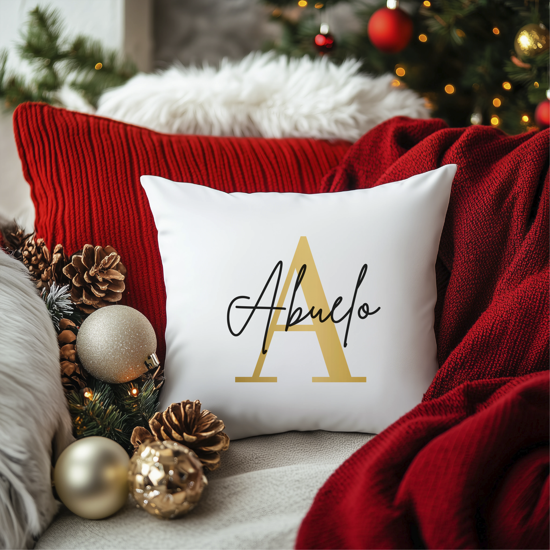 Dale un toque único a tu decoración estas fiestas con nuestro Cojín Navideño Personalizado, diseñado para llenar tu hogar de calidez y espíritu navideño. Añade el parentesco o nombre de quien tú elijas y crea un detalle especial que sorprenderá a familiares y amigos.