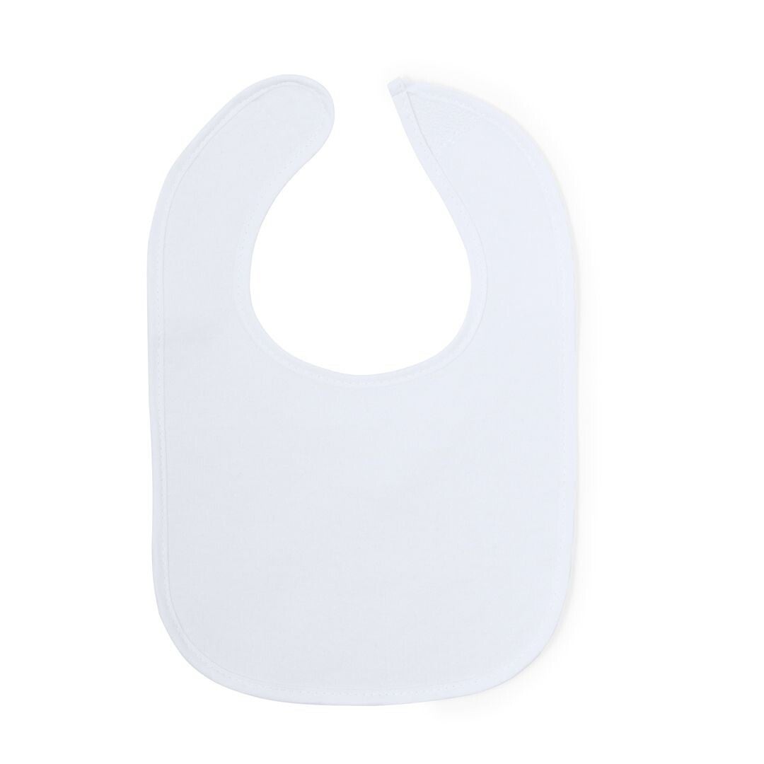 Práctico babero infantil confeccionado en algodón, con cierre de velcro para un mejor ajuste de color blanco. Personalizable con nombre, foto o texto sin límite de color.